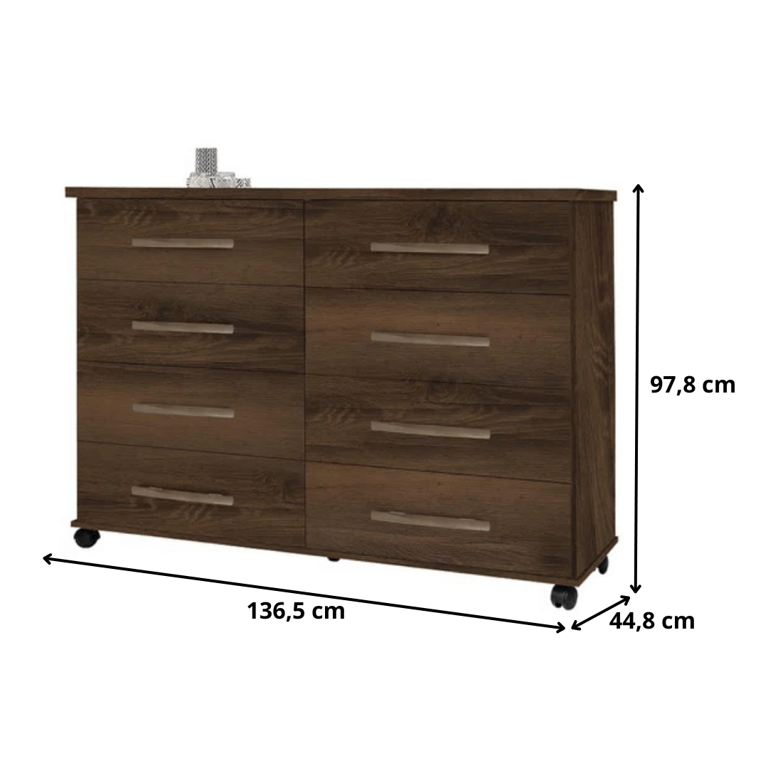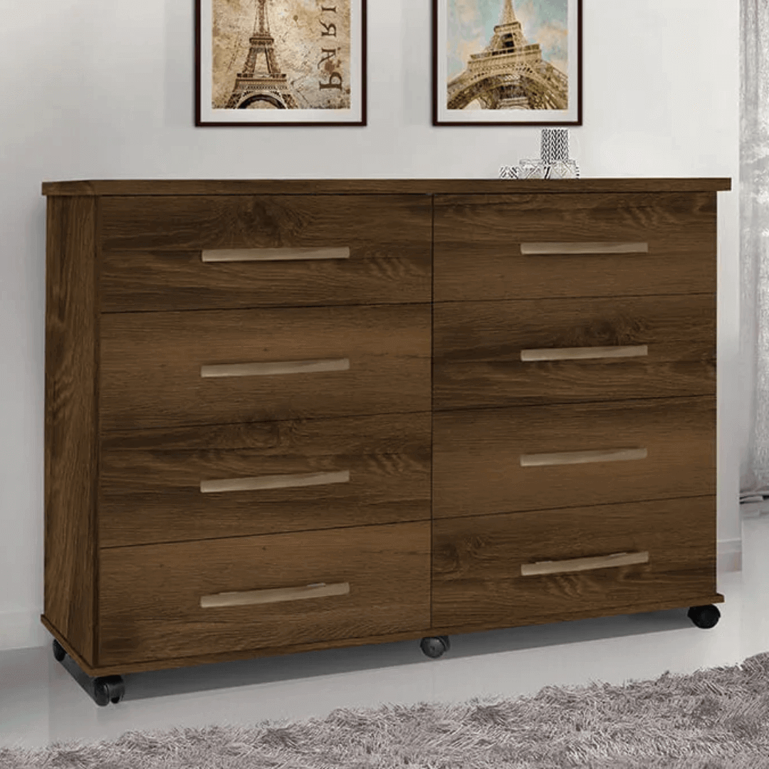 A Cômoda Jade é o produto certo para complementar seu quarto com charme e modernidade. Possui design sofisticado que agrega elegância e beleza ao ambiente. Estrutura de alta qualidade confeccionada em MDP de 15 e 25 mm. Além disso possui como diferenciais, as corrediças metálicas, puxadores em ABS e rodízios que facilitam o manuseio do móvel.